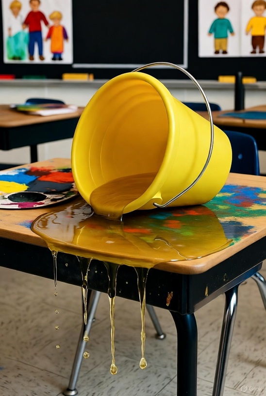Uma vez, também causei uma grande bagunça ao derramar água manchada de tinta do balde na sala de aula, o que me rendeu uma bronca do professor.