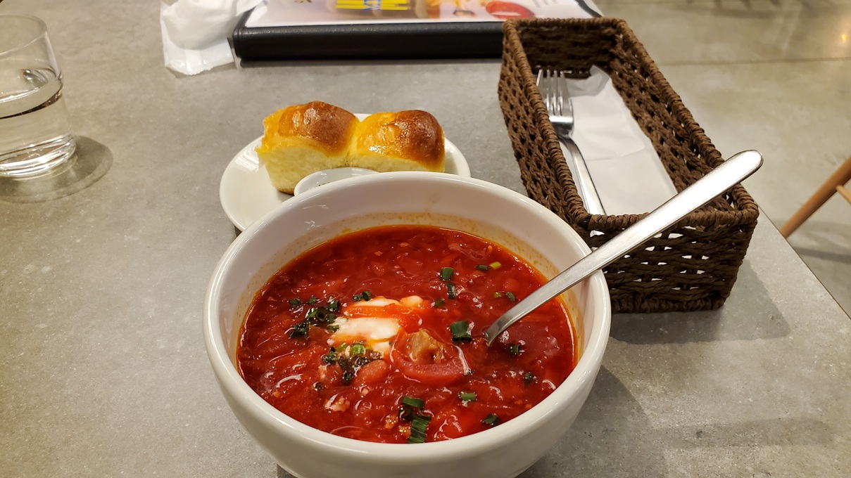 De primero tomé borscht, la sopa clásica de remolacha con carne y verdura que seguramente es el plato casero más famoso de Ucrania.