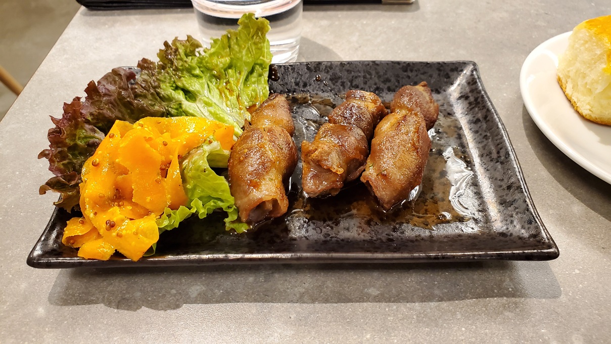 Jag hade fortfarande lite utrymme, så jag avslutade med friterade auberginerullar — tunna skivor aubergine med fyllning som friteras.