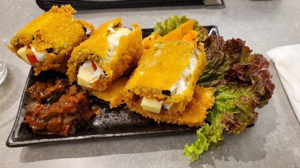 Ik had nog een beetje ruimte, dus ik sloot af met gefrituurde auberginerolletjes — dunne plakken aubergine met vulling en gefrituurd.